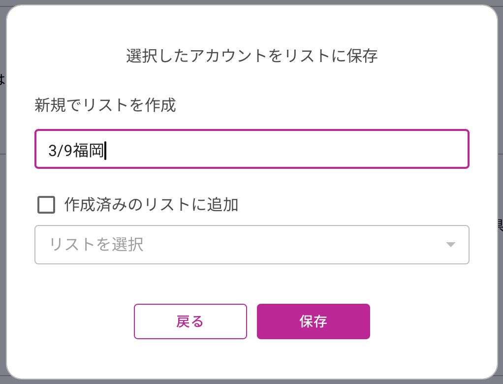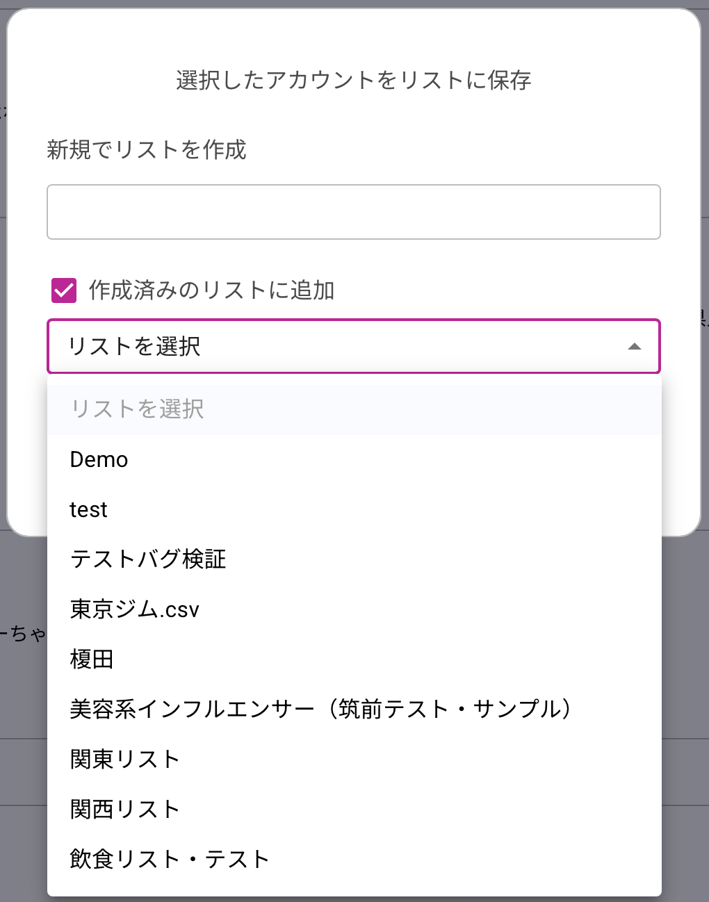 ③既存のリストに追加したい場合は「作成済みのリストに追加」にチェックを入れ、リストを選択し「保存」をクリック