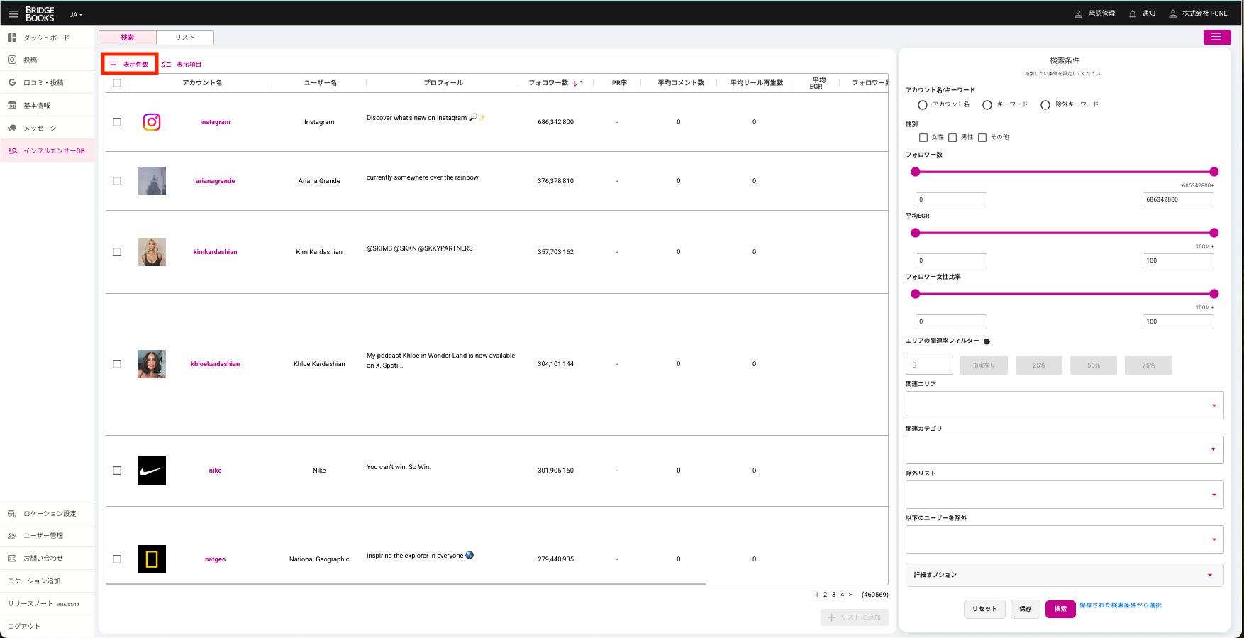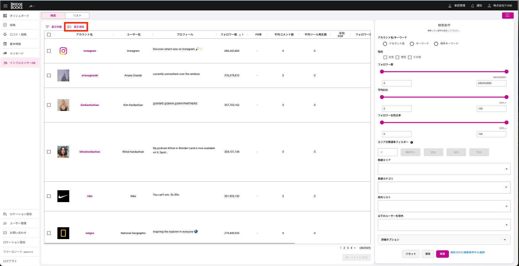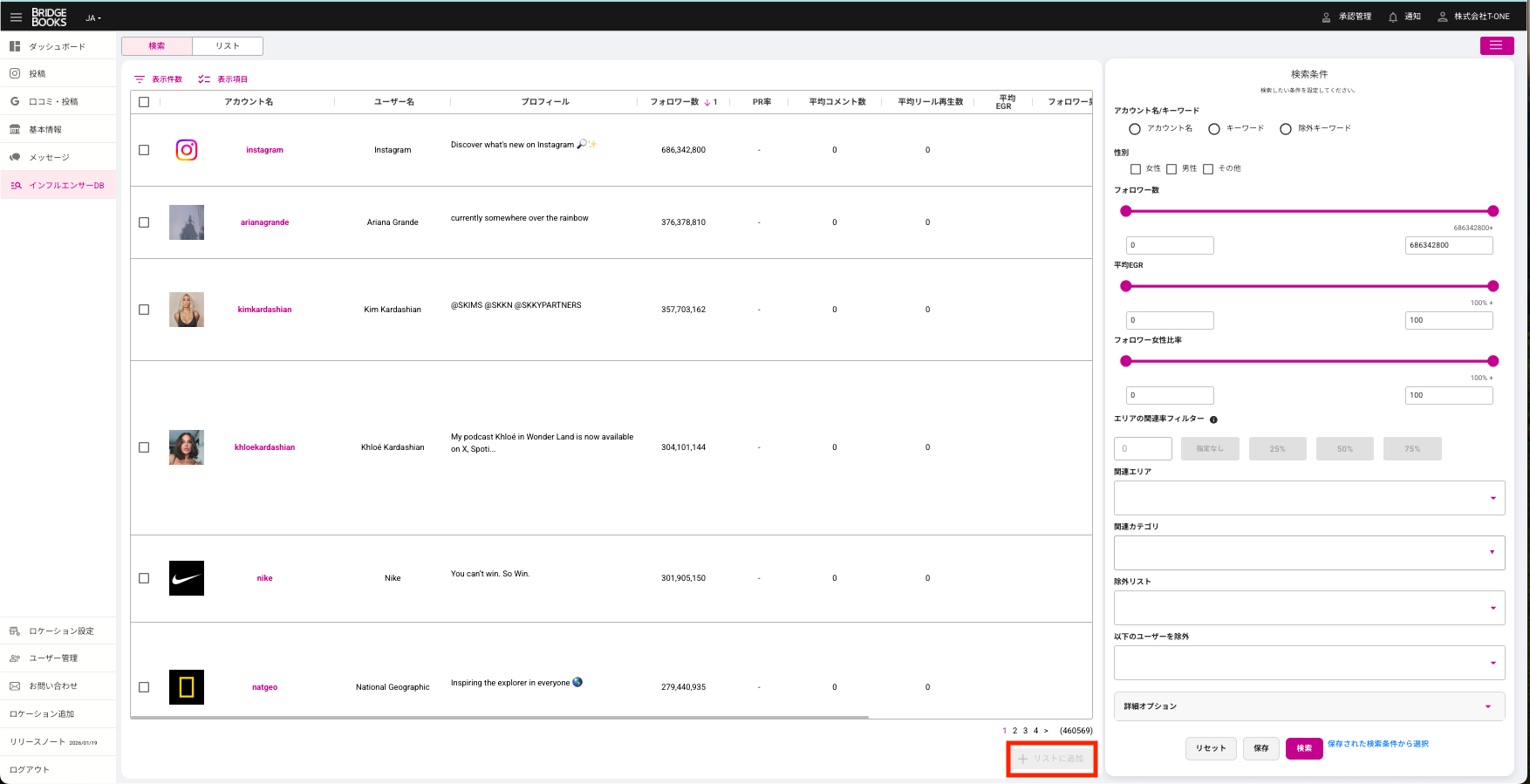 上記で指定した条件で検索し、表示させた複数のアカウントをリスト化することができます。