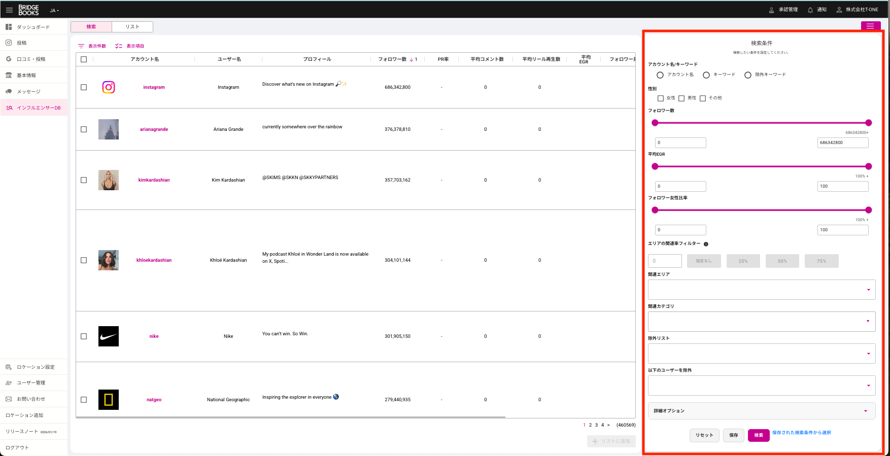 有料版・・・検索機能が無制限で利用可能。また、条件に合うインフルエンサーのリスト化ができる。